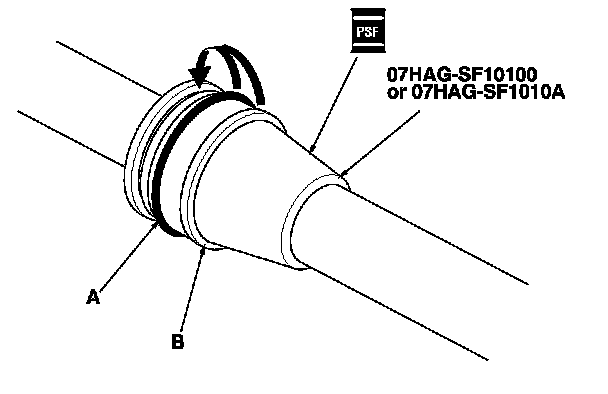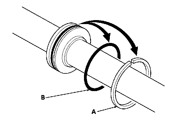 31. Apply power steering fluid to the surface of the ball joint boot clip guide. Slip two new seal rings (A) over the ball joint boot clip guide from the smaller diameter end, and expand them. Install only two rings at a time from each end of the pinion shaft sleeve (B).