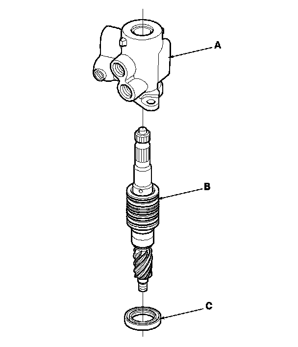 23. Separate the valve housing (A) from the pinion shaft/valve (B) using a press, then remove the pinion oil seal (C).