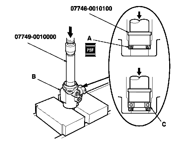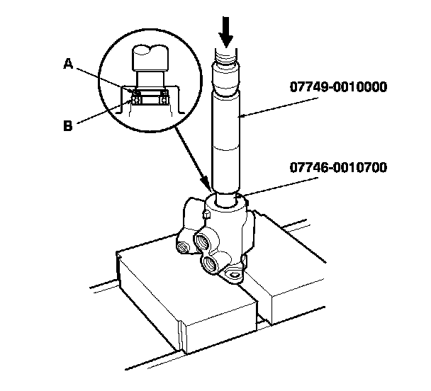 36. Apply power steering fluid to the seal ring lip of the new valve oil seal (A), then install the seal in the valve housing (B) using a hydraulic press, driver and attachment, 32 x 35 mm. Install the seal with its grooved side facing the tool.