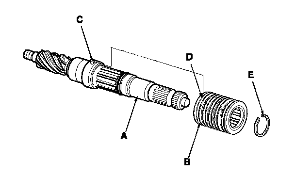 35. Apply power steering fluid to the surface of the pinion shaft (A). Slide the sleeve (B) onto the pinion shaft by aligning the locating pin (C) on the inside of the sleeve with the cutout (D) in the shaft. Then install the new snap ring (E) securely in the pinion shaft groove. Be careful not to damage the valve seal ring when inserting the sleeve.
