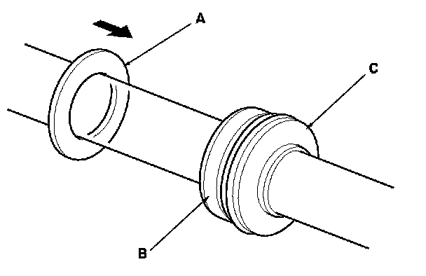 48. Coat the sliding surface of the cylinder end seal slider (A) and the new cylinder end seal (B) with power steering fluid. Place the seal on the cylinder end seal slider with its grooved side (C) facing opposite the cylinder end seal slider.