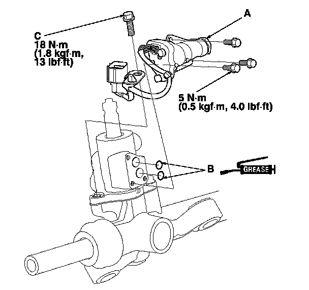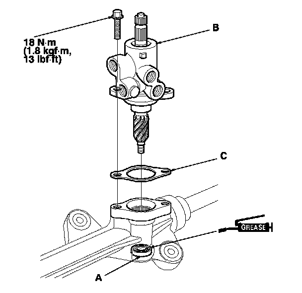 64. Apply multipurpose grease to the bearing (A) in the gearbox housing, and install the valve body unit (B) and a new gasket (C) by engaging the gears. Note the valve body unit installation position (direction of line connections). Then loosely install the two flange bolts.
