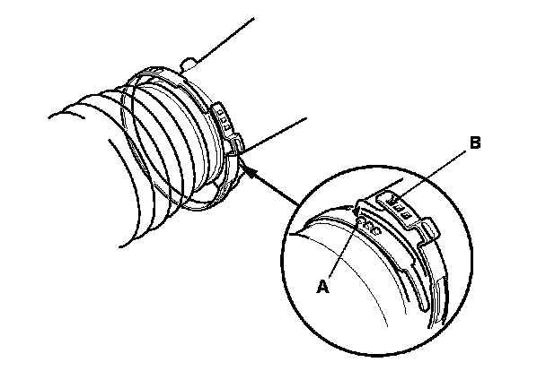 83. Install the new boot bands by aligning the tabs (A) with the holes (B) of the band.