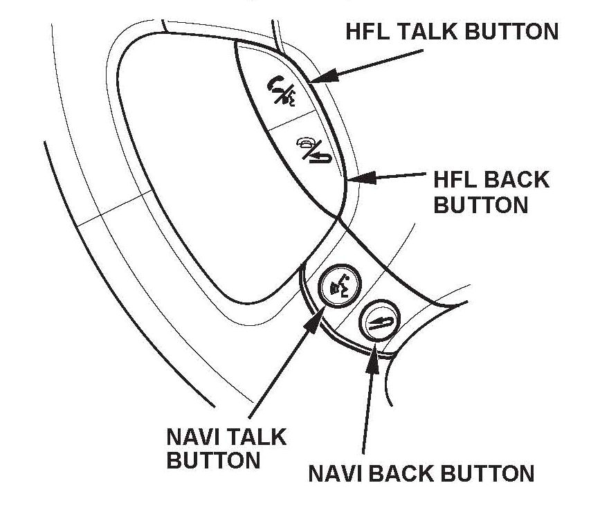 NAVI TALK button - Press and release this button on the steering wheel to activate the voice control system. After pressing and releasing TALK, wait for the beep, then speak the command.