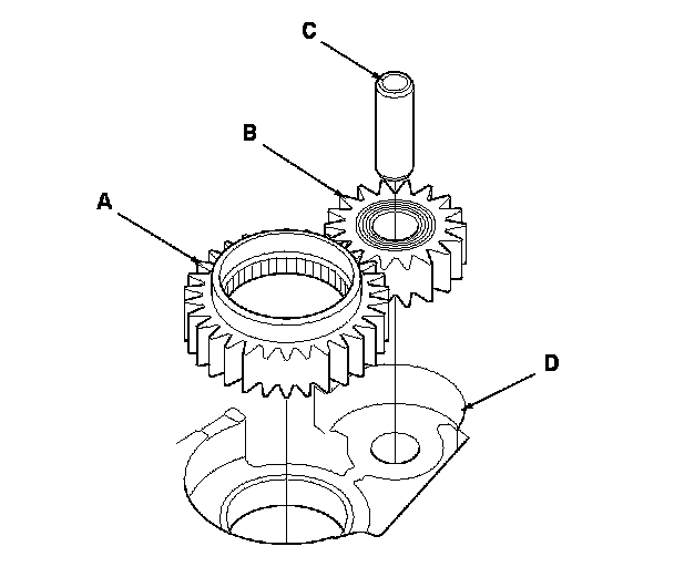 1. Install the ATF pump drive gear (A), driven gear (B), and ATF pump driven gear shaft (C) in the main valve body (D). Lubricate all parts with ATF, and install the ATF pump driven gear with its grooved and chamfered side facing up.