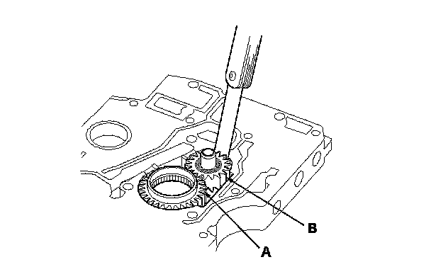 2. Measure the side clearance of the ATF pump drive gear (A) and driven gear (B).