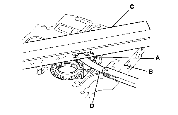 3. Remove the ATF pump driven gear shaft. Measure the thrust clearance between the ATF pump driven gear (A) and the valve body (B) with a straight edge (C) and a feeler gauge (D).