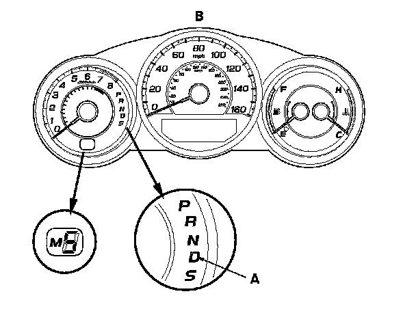 When the powertrain control module (PCM) senses an abnormality in the input or output system, the D indicator (A) in the gauge control module (B) will usually blink.