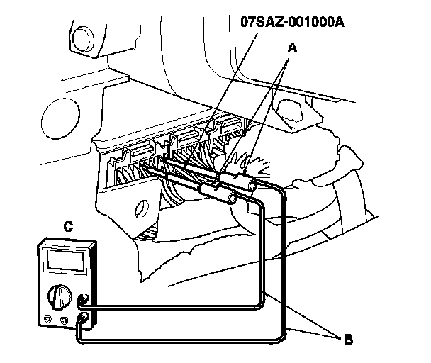5. If you cannot get to the wire side of the connector or the wire side is sealed, disconnect the connector and use the tester probe to probe the connectors from the terminal side. Do not force the probe into the connector.