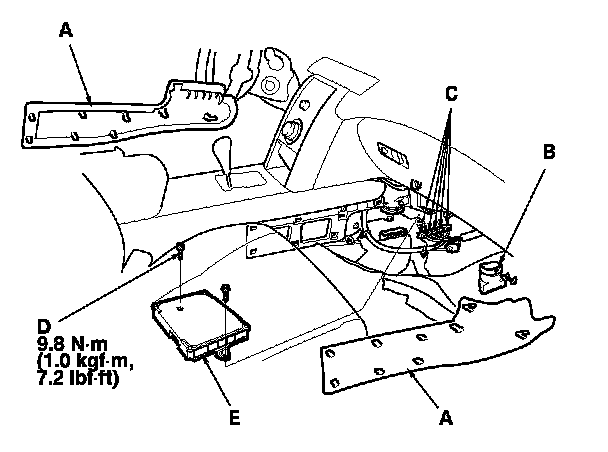 7. Remove the front console cover (A) Center Console Removal/Installation and pull back the carpet.