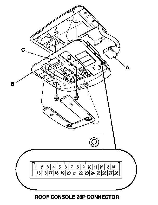 2. Disconnect the 28P connector (A) from the roof console (B).