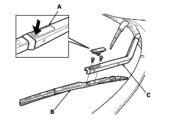 3. Disconnect the blade assembly (B) from the wiper arm (C) by removing the two screws from the arm.