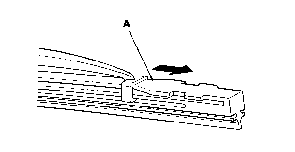 5. Examine the new wiper blades. If they have no plastic or metal reinforcement (A), remove the metal reinforcement strips from the old wiper blades, and install them in the slots along the edge of the new blade.