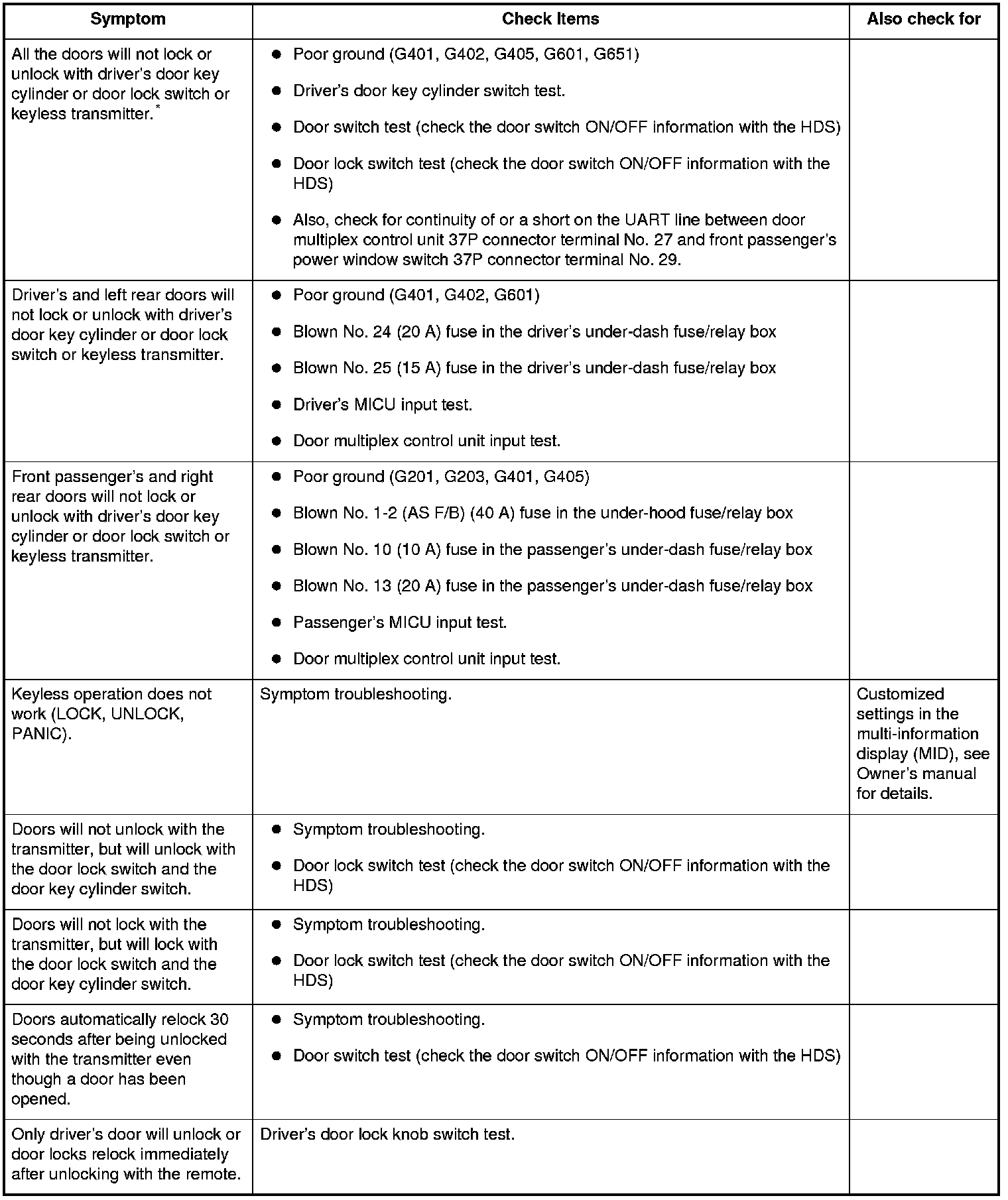 *: If only one door is not working properly, check that door's lock actuator first, then check the other items listed in this table.