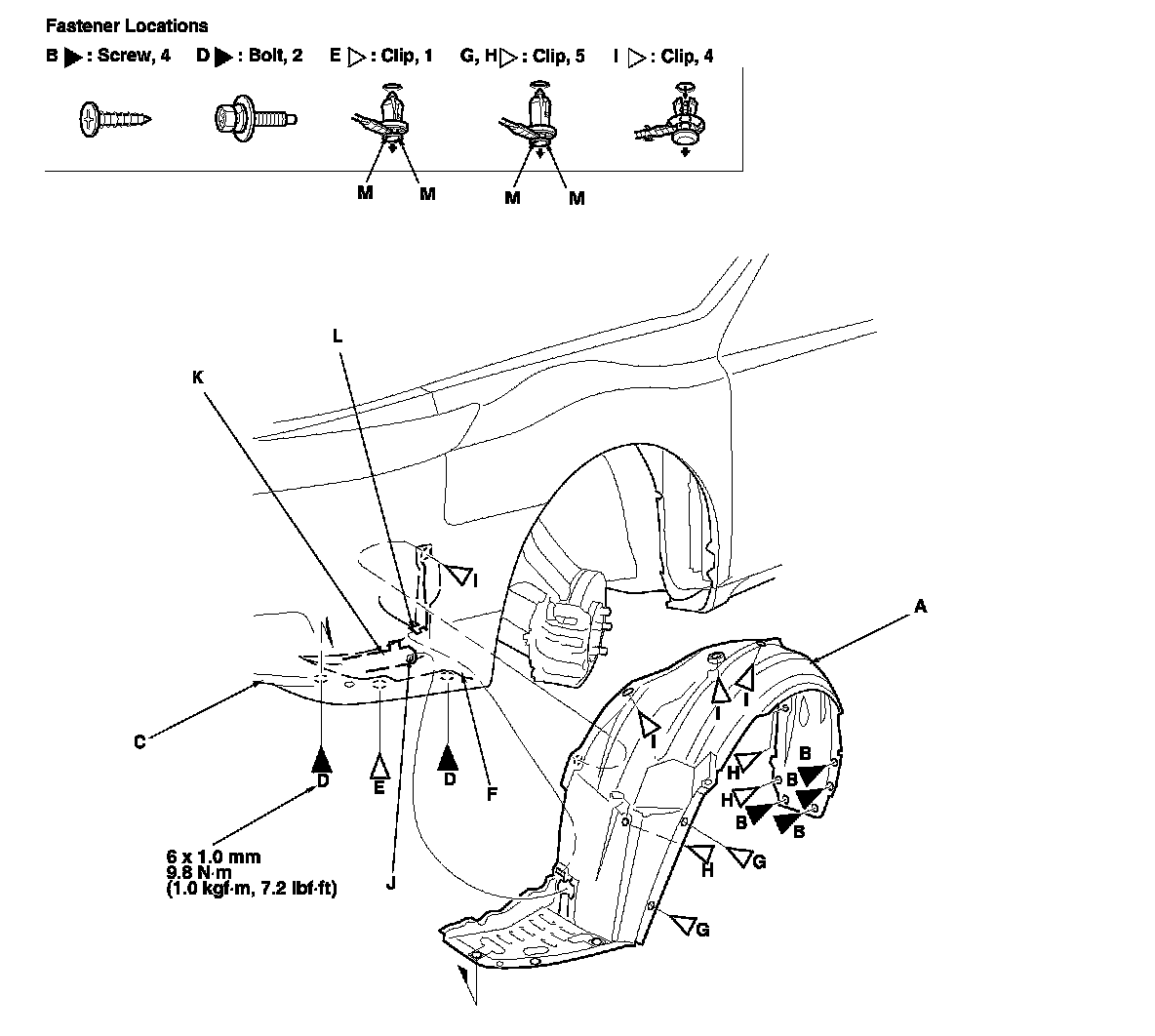From the wheel arch, remove the clips (H, I) that secure the front inner fender (and splash shield) to the body.