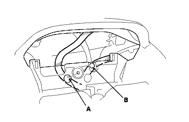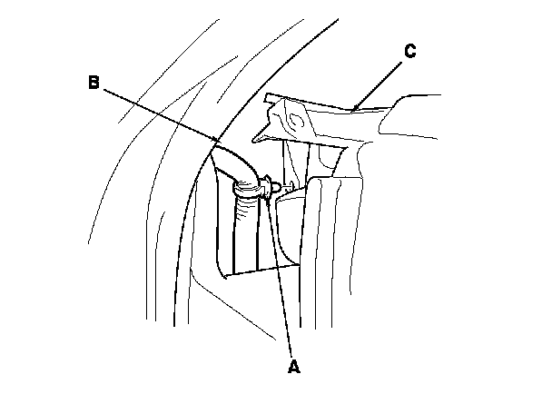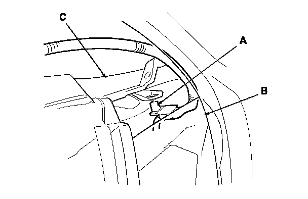 3. Remove the harness clip (A) from between the A-pillar (B) and the dashboard (C).