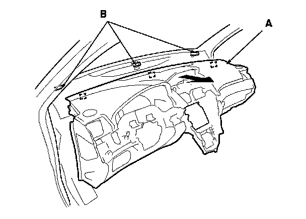 8. Lift up on the dashboard (A) to release it from the guide pins (B), then carefully remove the dashboard through the front door opening.