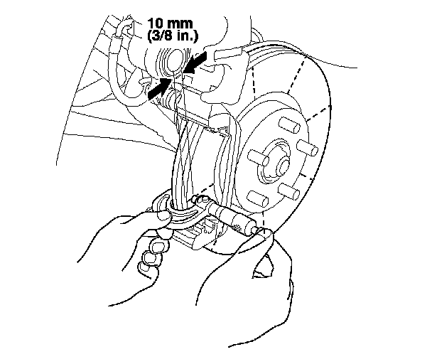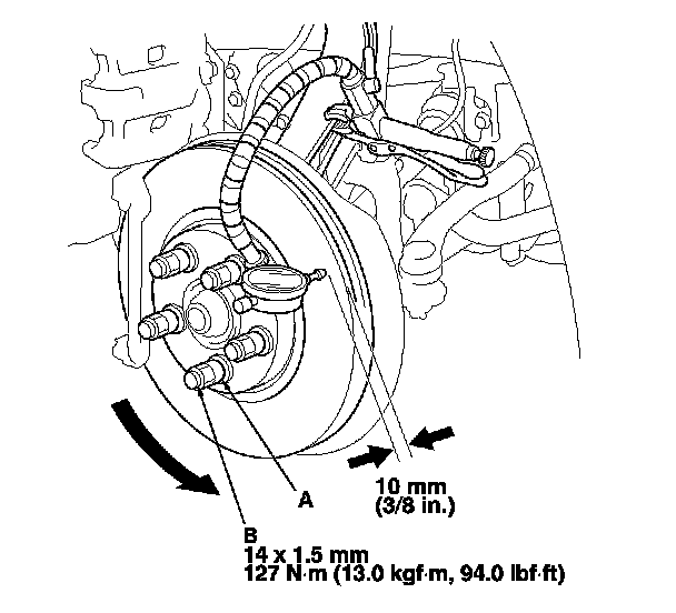 6. Set up the dial gauge against the brake disc as shown, and measure the runout at 10 mm (3/8 in.) from the outer edge of the brake disc.