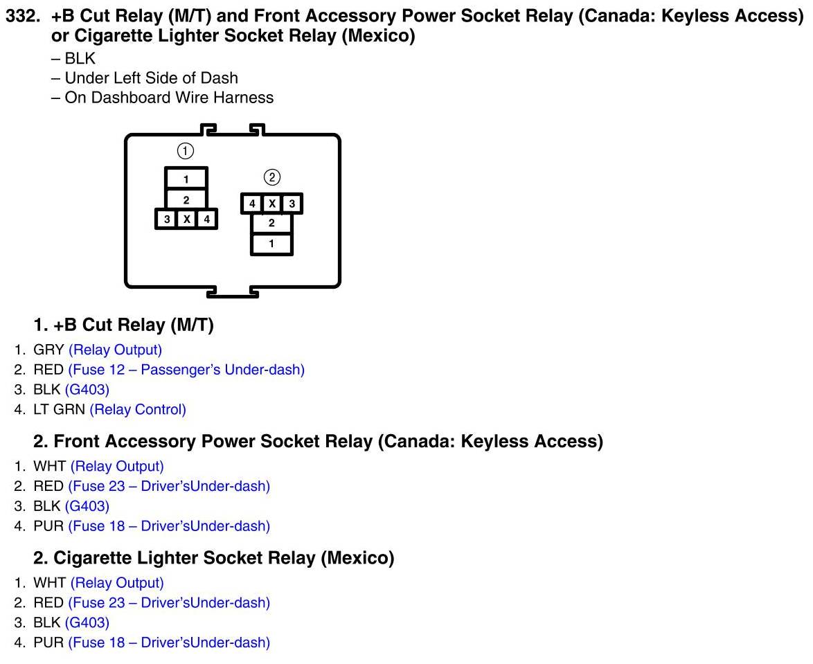 View 332 - +B Cut Relay (M/T) and Front Accessory Power Socket Relay (Canada: Keyless Access) Or Cigarette Lighter Socket Relay (Mexico) Connector View