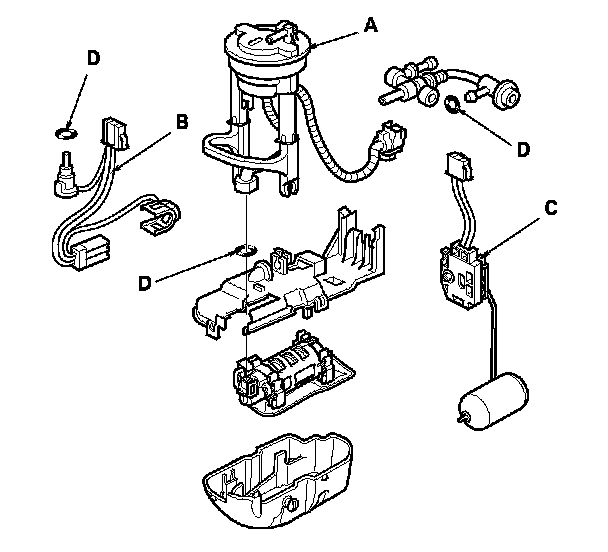4. Install the parts in the reverse order of removal with new O-rings (D). When installing the fuel tank unit, align the marks on the unit and the fuel tank. Fuel Tank Unit Removal and Installation