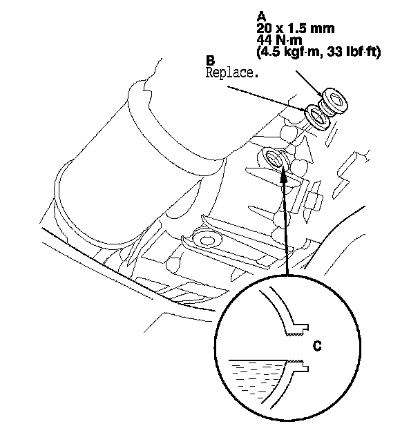 6. Refill the transfer assembly with the recommended fluid (hypoid gear oil) through the filler hole (C) until the fluid flows out. Use a SAE 90 viscosity hypoid gear oil, API classified GL4 or GL5 only.