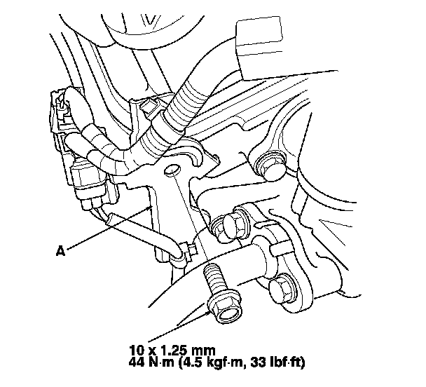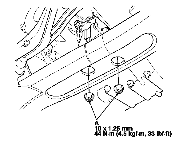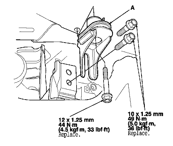 21. Remove the flange bolts, and remove the front subframe stiffener (A).