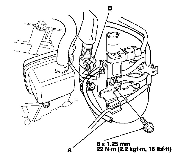 14. Disconnect the vacuum hose (A) and remove the harness clamp (B), then remove the engine mount control solenoid valve bracket from the rear cylinder head; use the bracket bolt hole to attach the 2008 V6 attachment arm (SIL02C000033).