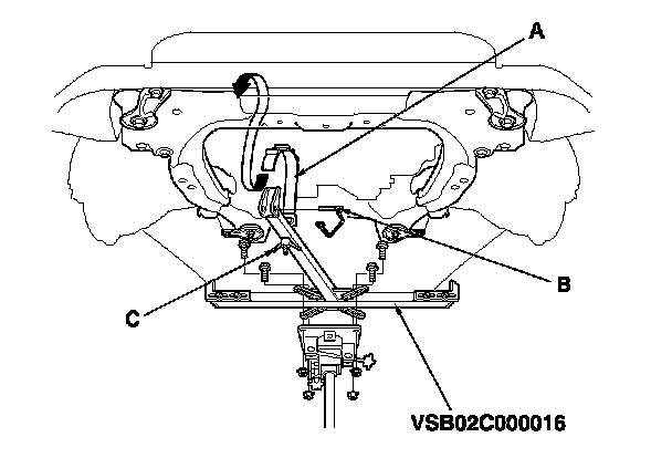 26. Attach the front subframe adapter (VSB02C000016) to a transmission jack, then raise up the jack to the subframe. Hang the belt (A) over the front of the subframe, then secure the belt by inserting the stop (B) and then tighten the wing nut (C).
