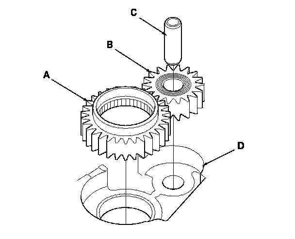 1. Install the ATF pump drive gear (A), the driven gear (B), and the ATF pump driven gear shaft (C) in the main valve body (D). Lubricate all parts with ATF, and install the ATF pump driven gear with its grooved and chamfered side facing up.