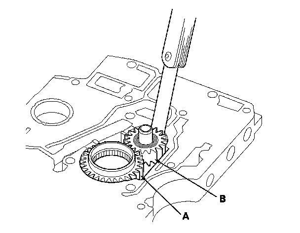 2. Measure the side clearance of the ATF pump drive gear (A) and the driven gear (B).