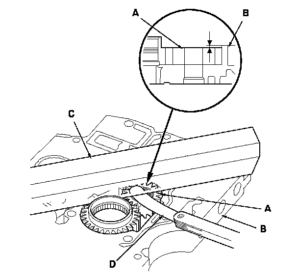 3. Remove the ATF pump driven gear shaft. Measure the thrust clearance between the ATF pump driven gear (A) and the main valve body (B) using a straight edge (C) and a feeler gauge (D).