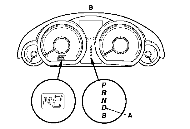 When the powertrain control module (PCM) senses an abnormality in the input or output system, the D indicator (A) in the gauge control module (B) will usually blink.
