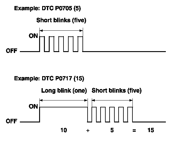 3. Select SCS mode, then observe the D indicator in the gauge control module. Codes 1 through 9 are indicated by individual short blinks. Code 10 and above are indicated by a series of long and short blinks. One long blink equals 10 short blinks. Add the long and short blinks together to determine the code.