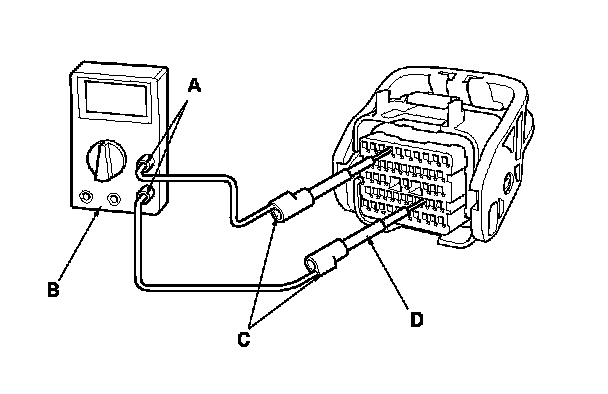 5. Connect one side of the patch cord terminals (A) to a commercially available digital multimeter (B), and connect the other side of the patch cord terminals (C) to a commercially available banana jack (Pomona Electronics Tool No. 3563 or equivalent) (D).