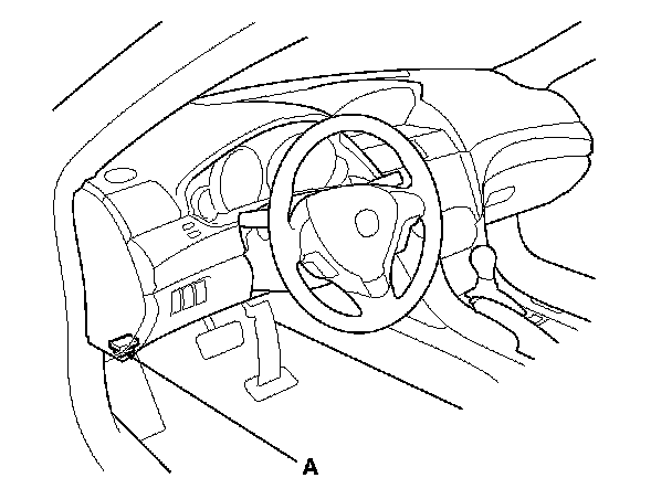 When the Honda Diagnostic System (HDS) is connected to the data link connector (DLC) (A) located under the driver's side of the dashboard, it will indicate the diagnostic trouble code (DTC) when the ignition switch is turned to ON (II), or the engine start/stop button is pressed to select the ON mode and the appropriate menu is selected.