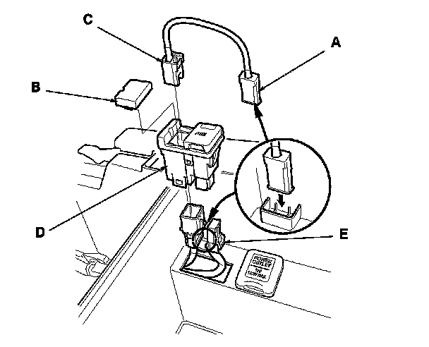 3. Carefully pull out the auxiliary jack assembly (D) from the center console box, then disconnect the 5P connector (E) and remove the USB adapter cable connector.