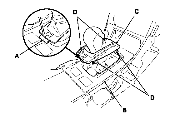 3. Apply protective tape (A) to the A/T shift panel (B) along the side edge of the shift lever boot base (C). Pry up on the edge of the shift lever trim with a flat-tipped screwdriver wrapped with protective tape to release the hooks (D).