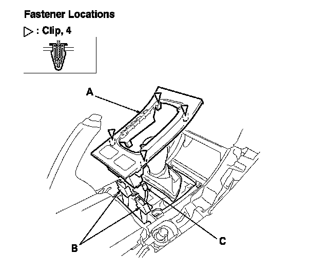 4. Detach the clips by pulling the A/T shift panel (A) up. Disconnect the seat heater switch connectors (B), and A/T gear shift position indicator light connector (C).