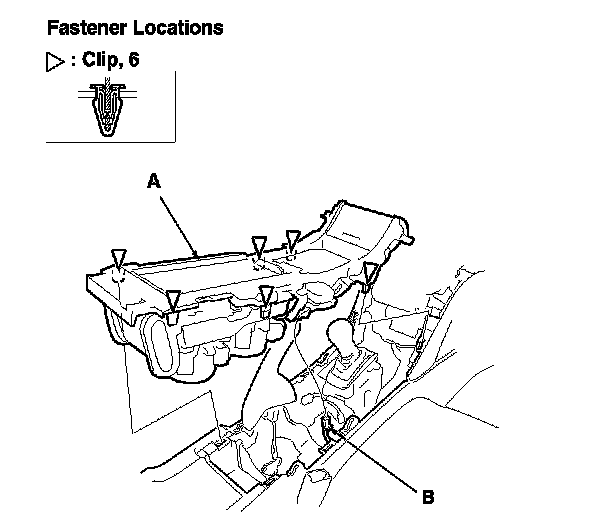 5. Detach the clips by pulling the center console panel (A) up. Disconnect the accessory power socket connector (B), and remove the center console panel.