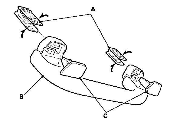 3. Pinch the clips (A) to release the hooks (B), then remove the grab handle (C).