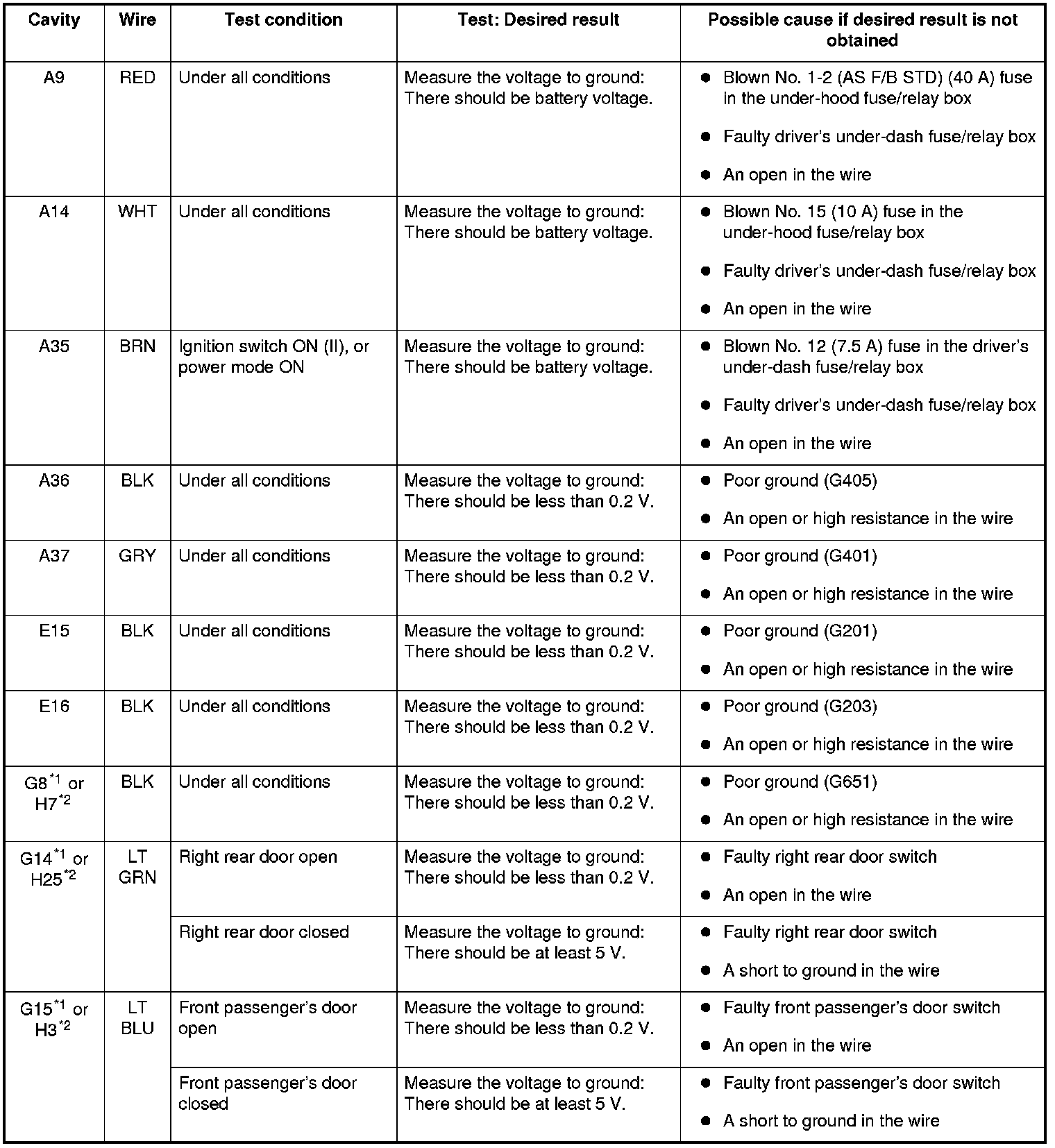 12. Reconnect the connectors to the passenger's under-dash fuse/relay box, and do these input tests at the following connectors.