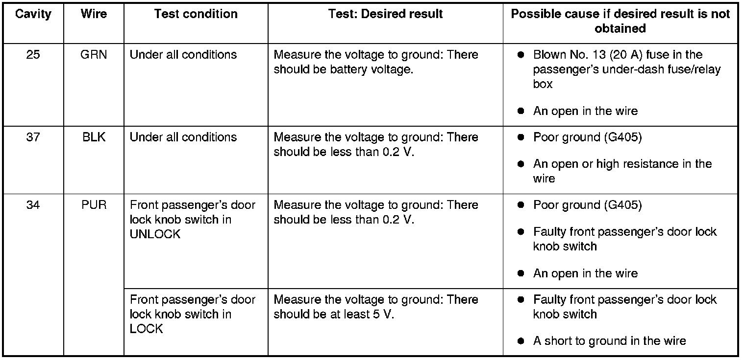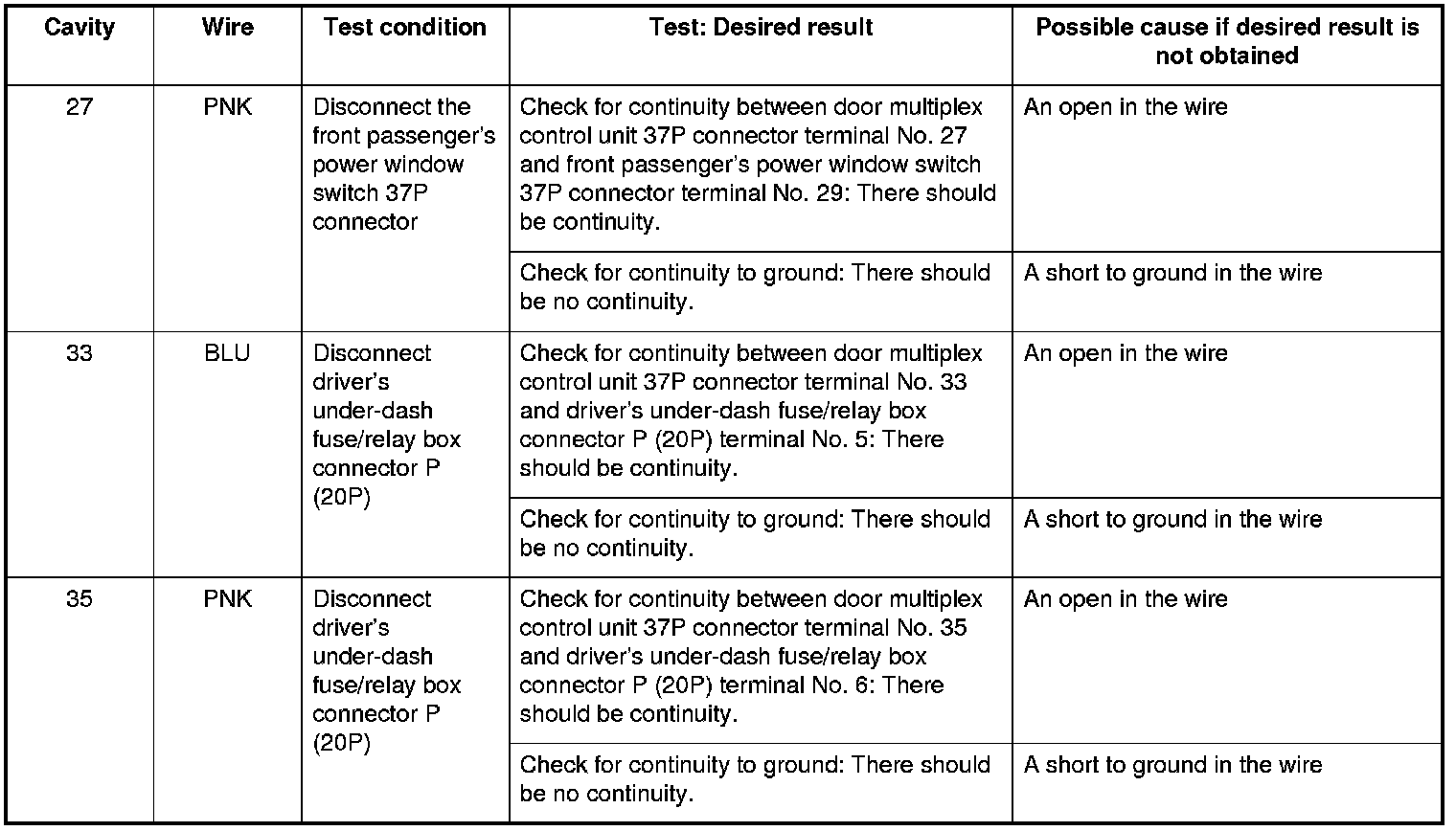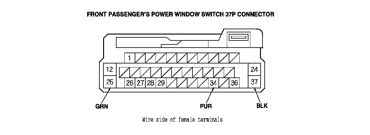 22. Reconnect the 37P connector to the front passenger's power window switch, and do these input tests at the connector.