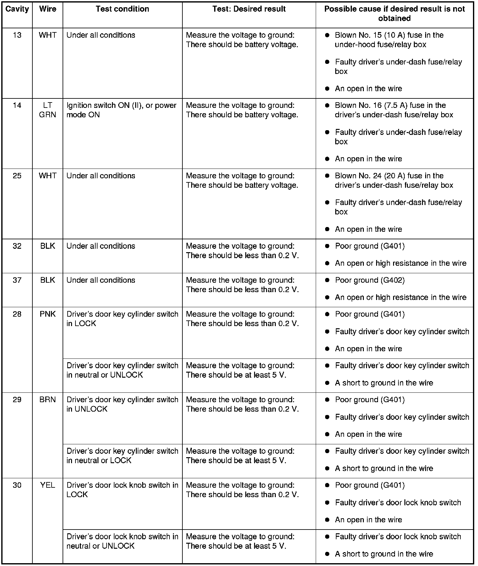 6. Reconnect the connectors to the driver's under-dash fuse/relay box, and do these input tests at the following connectors.