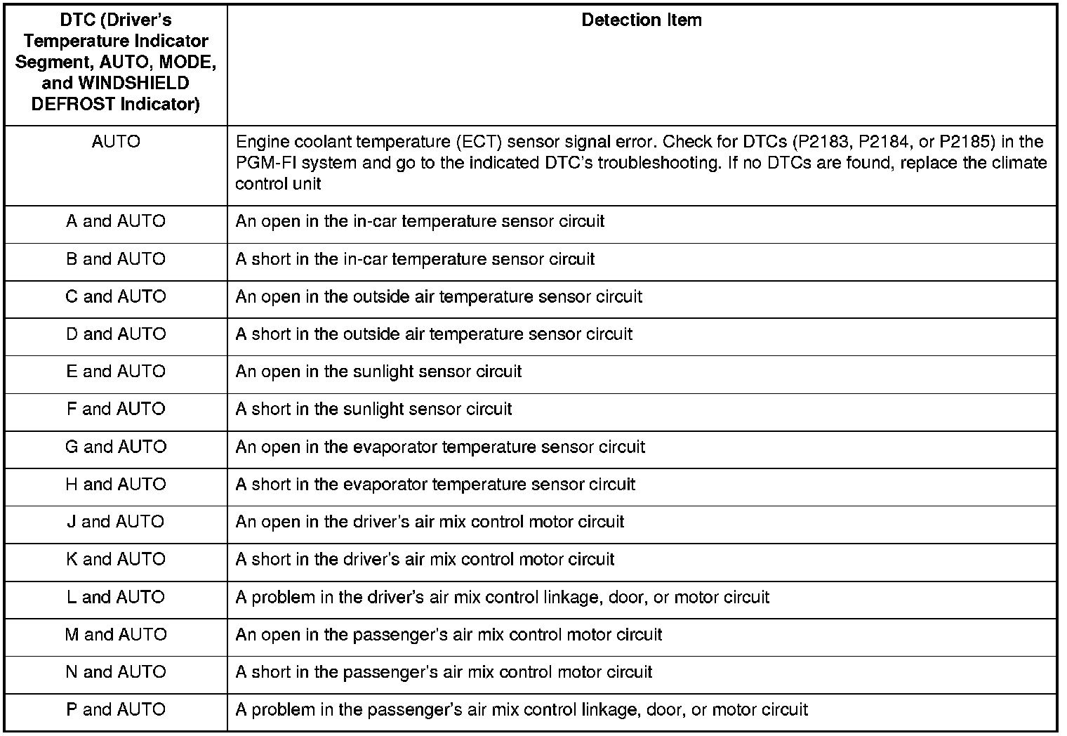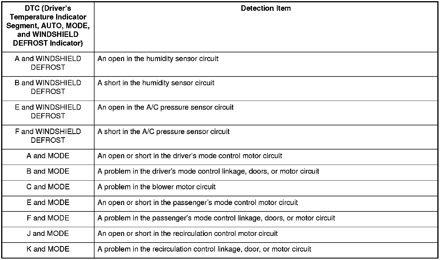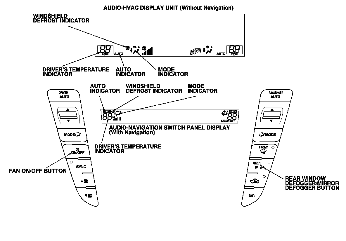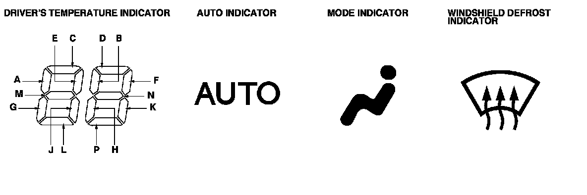 NOTE: If the driver's indicator segments A, C, E, G, M, with the AUTO indicator, MODE indicator, and the WINDSHIELD DEFROST indicator are on at the same time, there may be an open in the sensor common ground wire.
