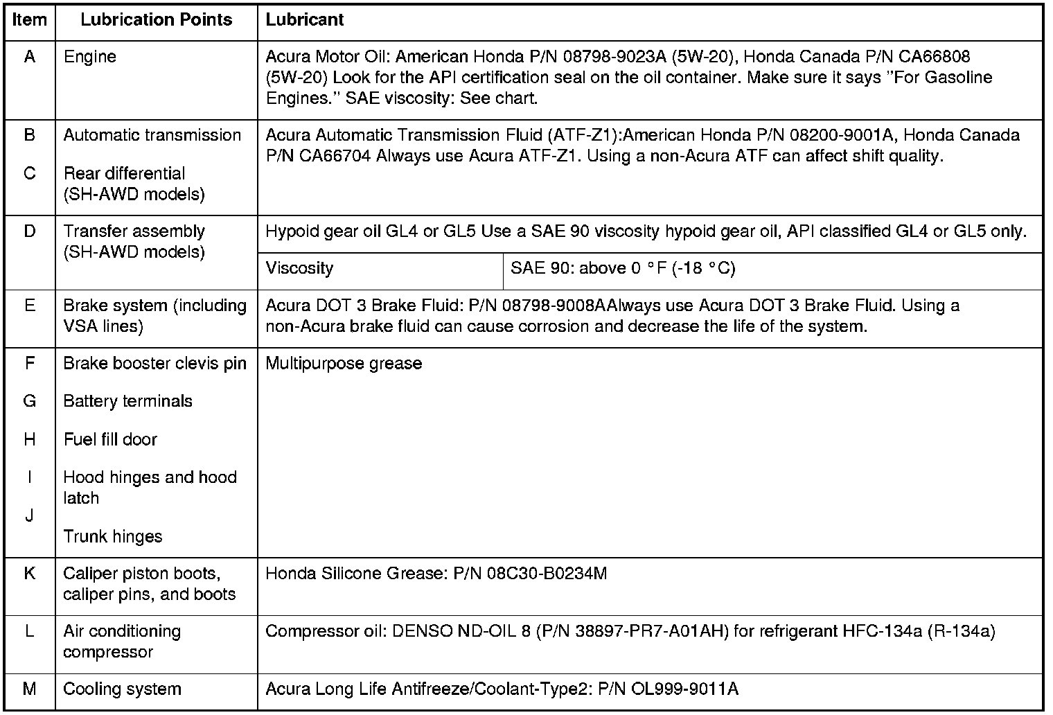 - Lubricate the following areas using the recommended lubricants and fluids.