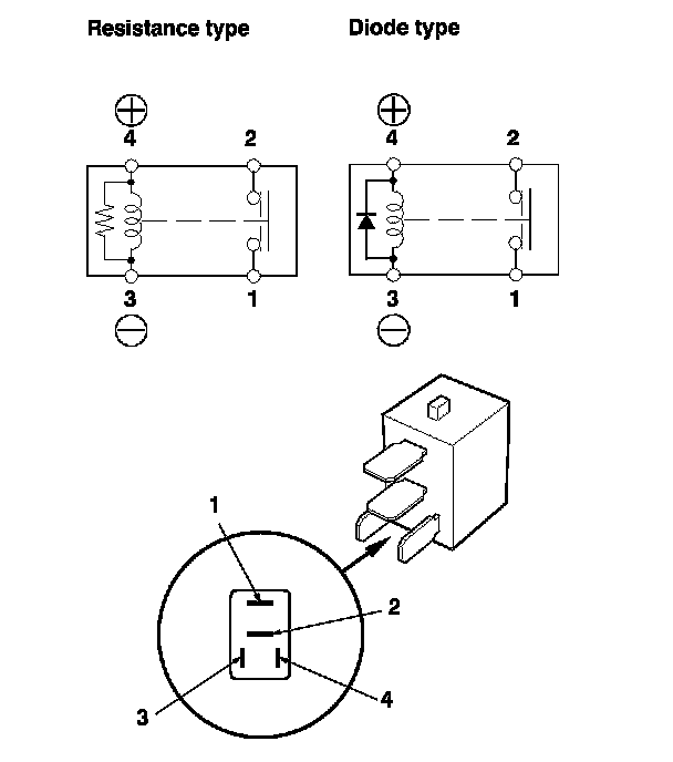 - There should be continuity between terminals No. 1 and No. 2 when battery power is connected to terminal No. 4, and body ground is connected to terminal No. 3.