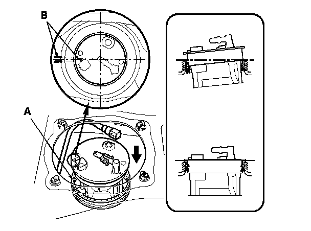 3. Align the marks (B) on the fuel tank and fuel tank unit, then insert the fuel tank unit into the fuel tank until the fuel tank unit rests on top of the base gasket.
