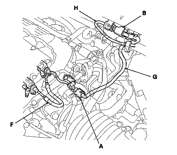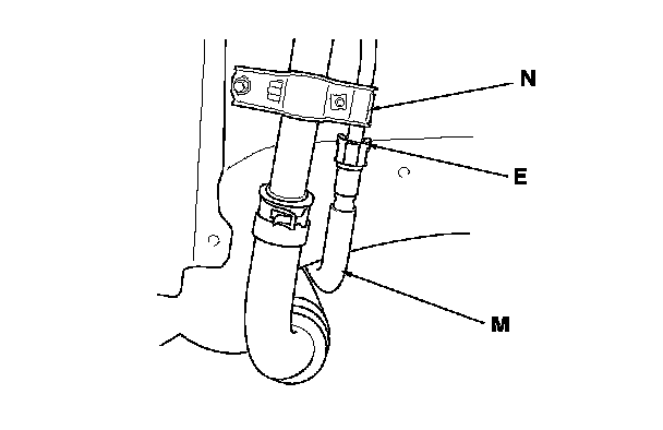 The fuel line/quick-connect fittings (A, B, C, D, and E) connect the fuel joint hose (F) to the fuel feed hose (G), the fuel feed hose to the fuel line (H), the fuel line (I) to the fuel tank unit (J), the fuel vapor line (K) to the EVAP canister (L), and the fuel tank vapor recirculation tube (M) to the fuel fill pipe (N). When removing or installing the fuel feed hose, the fuel tank unit, or the fuel tank, or when disconnecting or connecting the quick-connect fittings, pay attention to the following: