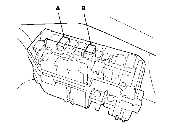 7. Remove PGM-FI main relay 1 (A) and the ETCS control relay (B) from the under-hood fuse/relay box.