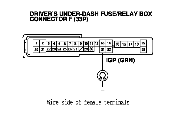 12. Check for continuity between driver's under-dash fuse/relay box connector F (33P) terminal No. 31 and body ground.